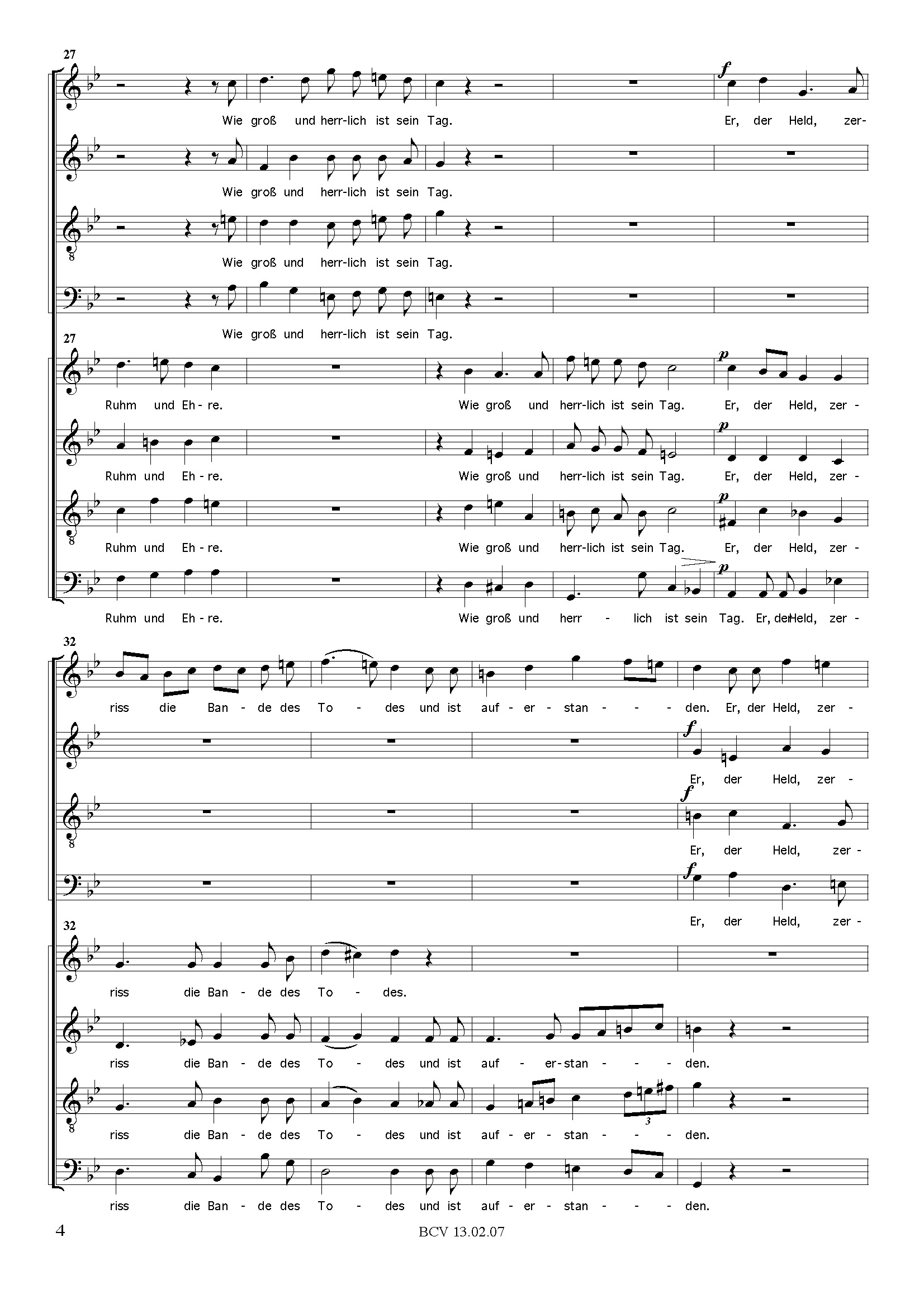 Halleluia! Jauchzt, ihr Chöre! Singt Jesu Christo Ruhm und Ehre. Wie groß und herrlich ist sein Tag. Er, der Held, zerriss die Bande des Todes und ist auferstanden, er, der für uns im Grabe lag. Sein ist Gewalt und Macht, er hat's vollbracht! Halleluia!